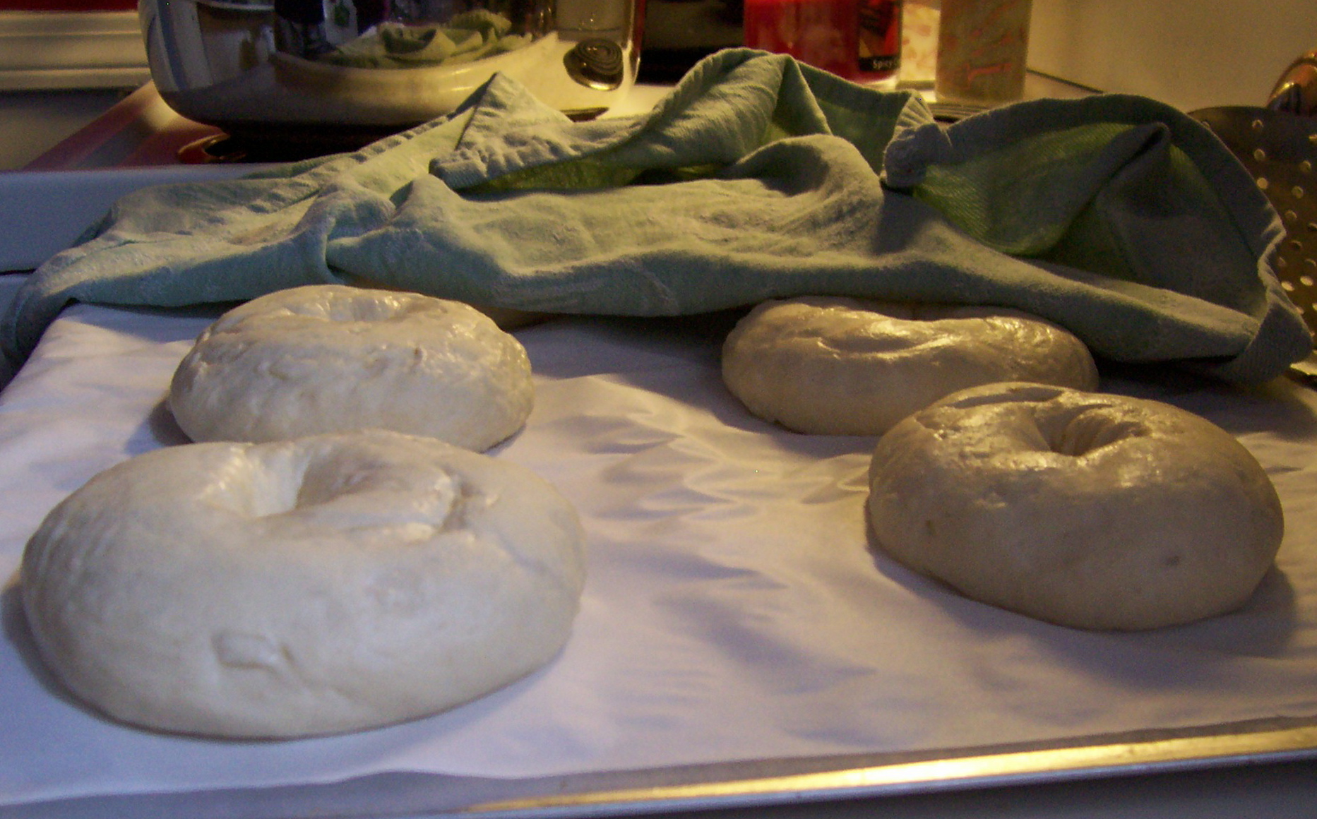 Roll each of the 12 pieces of dough into a long cigar-like shape, then connect the ends, overlapping and carefully pinching the seams together. Place 6 of the bagels on each of two cookie sheets on wax paper (or other lightly greased surface). Cover with a damp cloth and let rise in a warm place for 1-2 hours. (I usually heat the oven to 200, turn it off, and put bread in there to rise this time of year since it’s hard to find a warm enough place otherwise!)