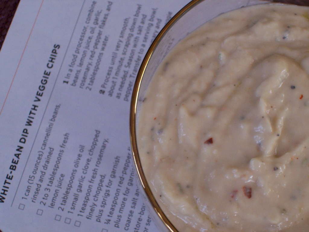 I found this recipe in an Everyday Food magazine while visiting with my grandmother. I ripped it out of the magazine with the intention of trying it, but somehow it managed to go untouched until this morning. Since I had all of the ingredients on hand, and had a family gathering to attend, I thought it would make a simple, healthful appetizer. I was pleased with the results, and will make it again soon. The rosemary was an interesting flavor in combination with the crushed red pepper flakes and fresh lemon. We enjoyed it with Rosemary Olive Oil Triscuits, but it would also be good with tortilla chips, pita chips, or the veggie chips recommended in the recipe itself.